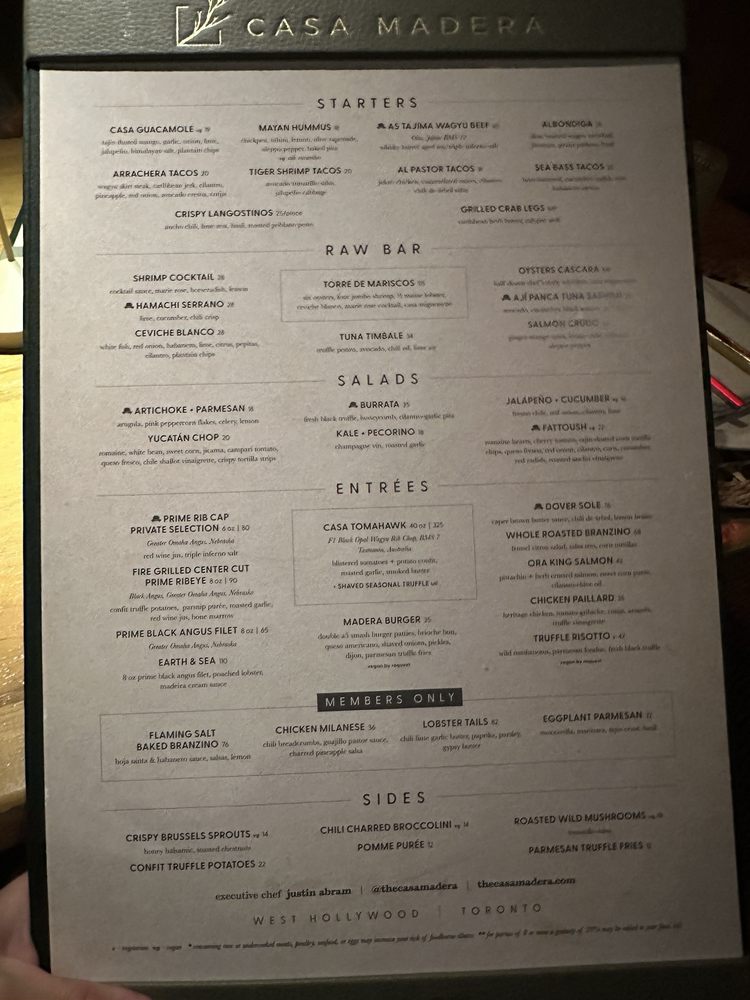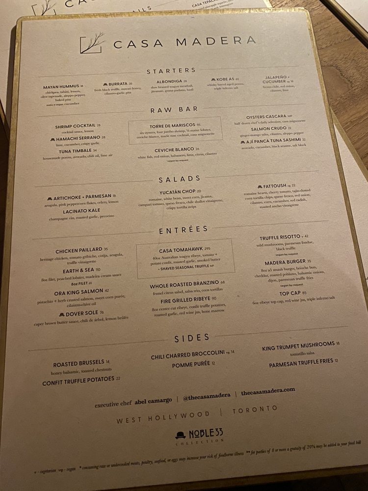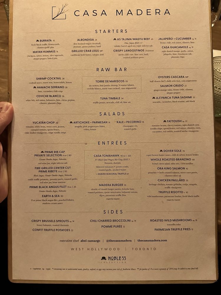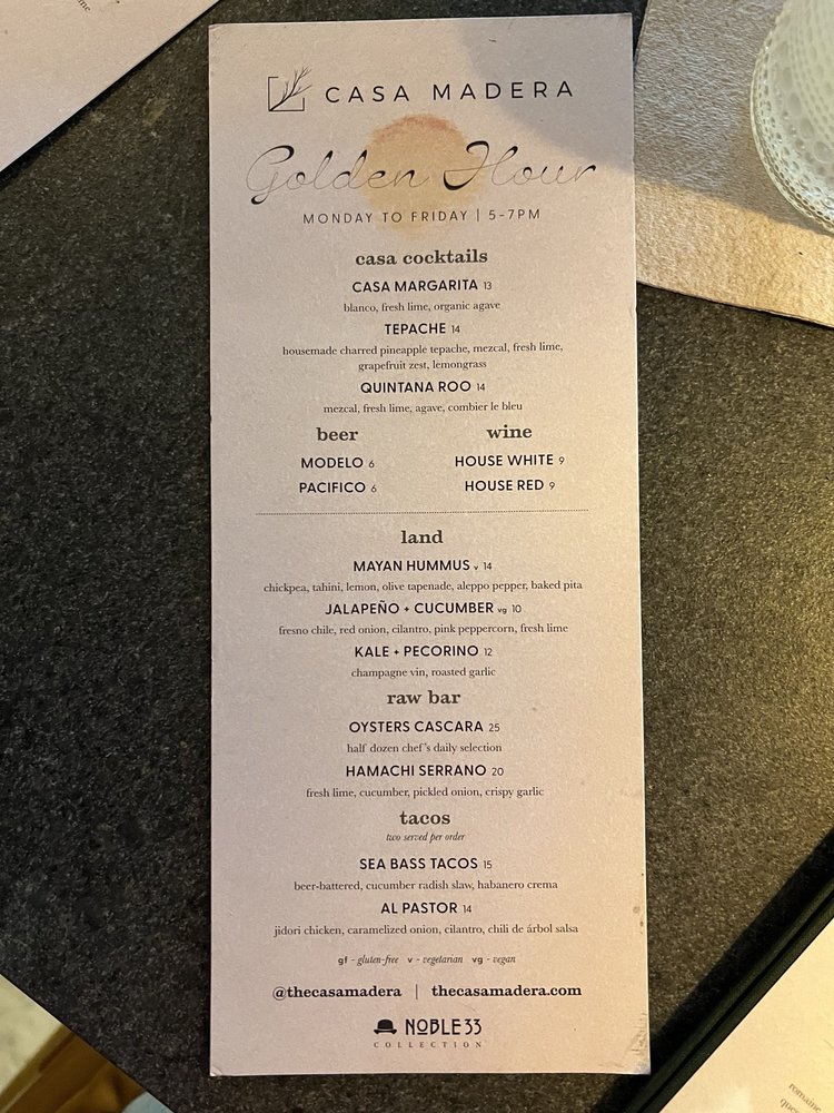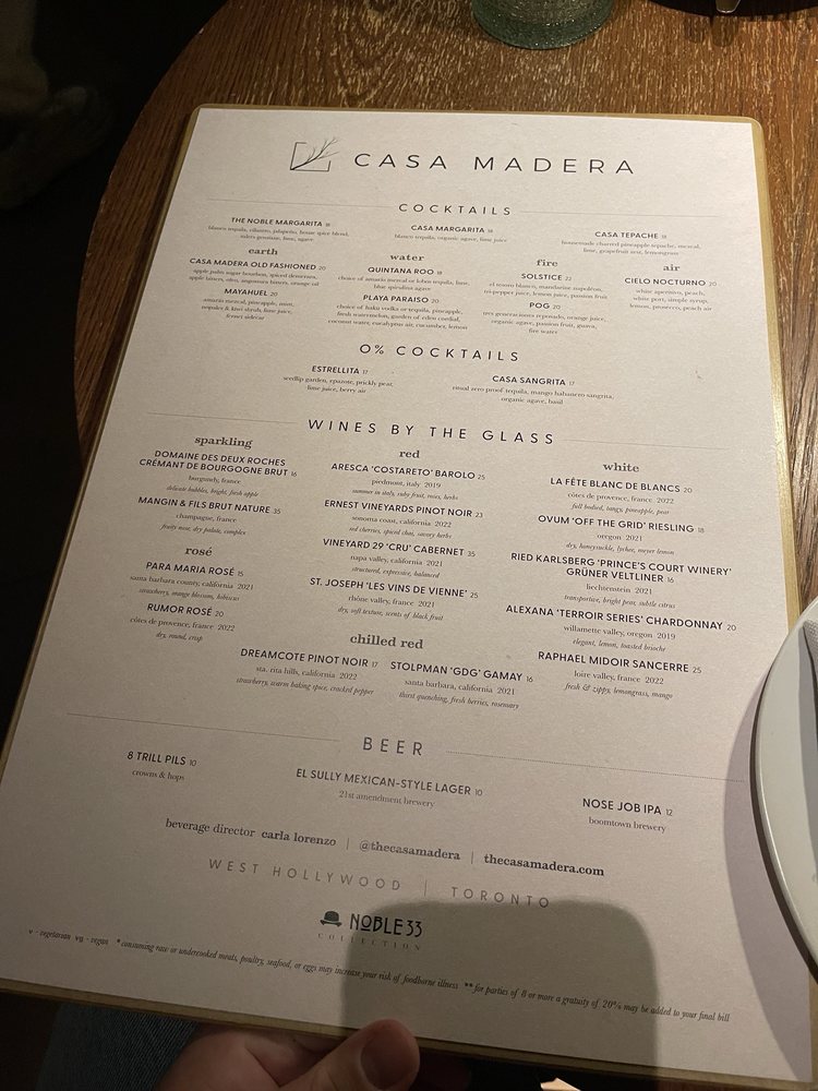 Introducing the menu at Casa Madera - West Hollywood, a trendy and classy dining spot on Sunset Blvd. The restaurant offers a variety of options including vegan dishes and has amenities like valet parking and outdoor seating. Customers rave about the beautiful ambiance and excellent service. The burrata with truffle honey and chile is a must-try, as well as the wagyu tacos and hummus. Happy hour specials are a hit, with fantastic deals and a lively atmosphere. The hand fans provided add a touch of charm to the dining experience. Overall, Casa Madera offers a unique blend of urban chic and tropical tranquility, making it a hidden gem in LA. Be sure to enjoy the delicious food and captivating ambience on your next visit.